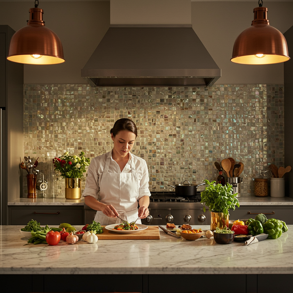 Мозаичная плитка позволяет создавать выразительные визуальные акценты. Фартук для кухни, оформленный мозаикой, становится не просто защитой стены, а центральным художественным элементом. Перламутровое или глянцевое покрытие создаёт завораживающую игру света, превращая обычную поверхность в произведение искусства.