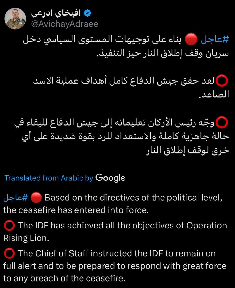 ❗️‘The CEASEFIRE has entered into force’ — IDF spox Avichay Adraee confirms ceasefire conditions