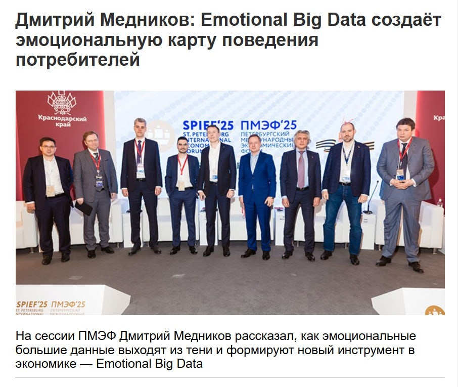 «Данные, накопленные "Русской Медиагруппой", позволяют совместить их с большими данными других отраслей и понять связь между действием (покупкой, поездкой, переводом) и чувствами человека, – И если наложить Emotional Big Data на метрики экономических действий, мы получим новое явление: эмоциональную карту, которая будет востребована в самых разных сферах – туризме, креативной экономике, вопросах развития демографии и так далее». – рассказал Дмитрий Медников. Рассказывают об эмоциональной карте потребителей, а сами без эмоций. Стоят, как неродные. Будто не футбольная команда ни разу. Могли бы уже и обняться. НЕ ВЕРЮ! (как сказал бы Станиславский, порицая актёров за неестественность и патетику на сцене).