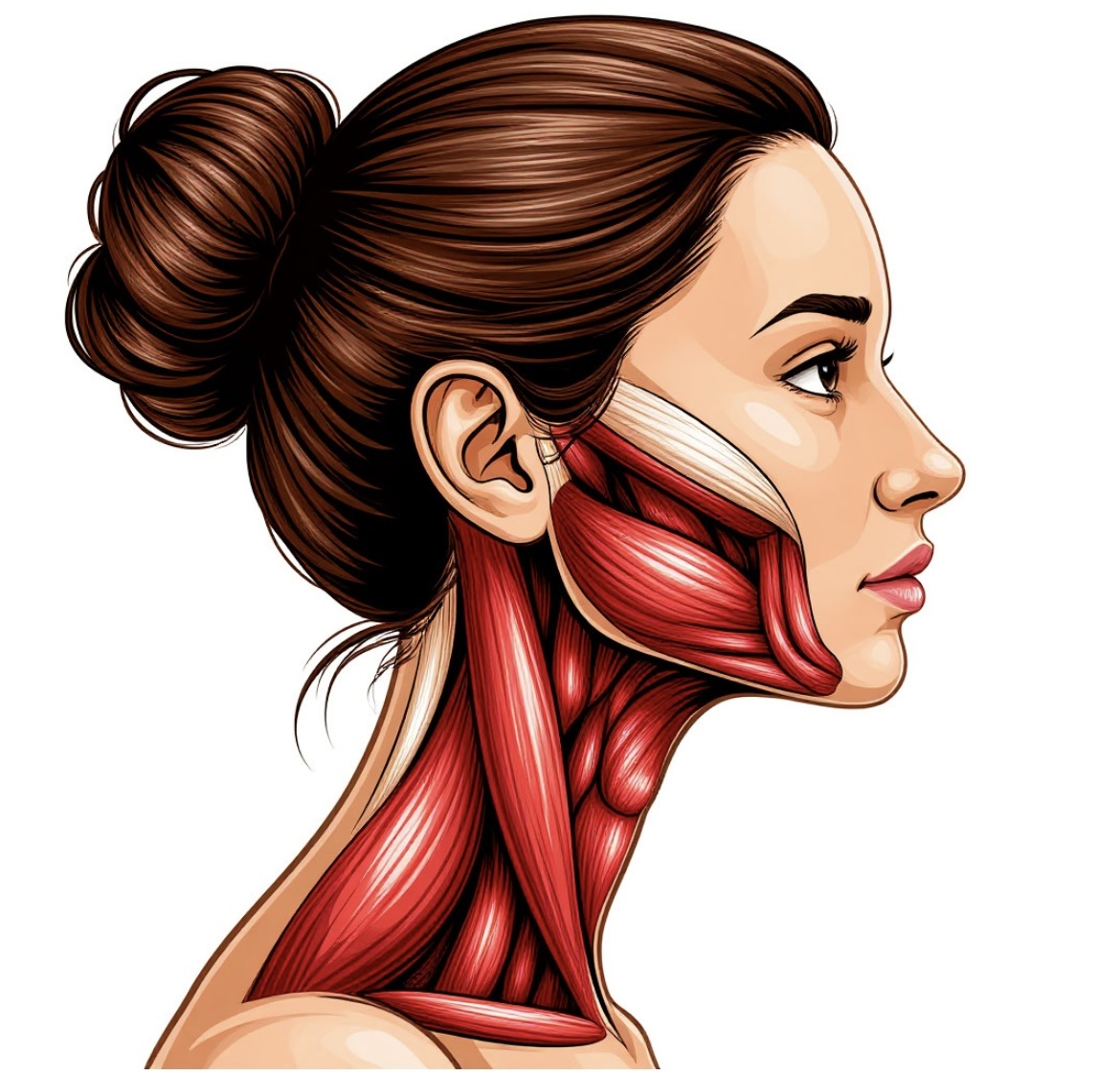 Интересный факт: подкожная мышца шеи (платизма) отвечает за молодость нижней части лица. Ее ослабление приводит к:
