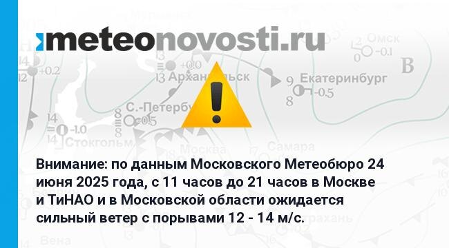 Внимание: по данным Московского Метеобюро 24 июня 2025 года, с 11 часов до 21 часов в Москве и ТиНАО и в Московской области ожидается сильный ветер с порывами 12 - 14 м/с. Перейти на сайт Прогноз погоды на 14 дней