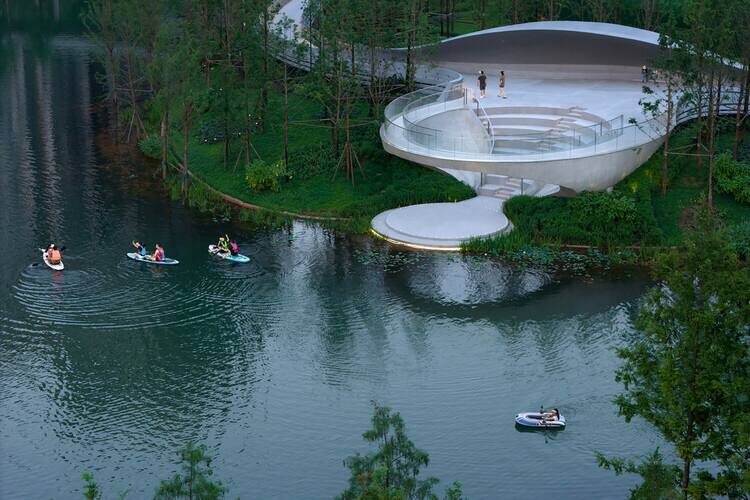 Проект «Лухум. Кольцо звёздного света» от HDEC AIR-CoLAB Studio расположен на острове в центре парка «Вихрь» в Чэнду, Китай. Чтобы добраться до острова с любой стороны, посетителям приходится идти по лесным тропинкам или плыть на маленькой лодке почти тысячу метров. В результате этот маленький остров стал самым спокойным уголком во всём парке, вдали от шума и суеты города, напоминающим идиллическую мечту. Разнообразные пейзажи с меняющимися ракурсами — но в этой среде, тесно связанной с природой, небольшое здание диаметром 25м. может тем не менее стать смысловым акцентом парка. Во время прогулки или плавания в лодке посетители могут испытать ощущение «смены видов с каждым шагом». По мере того, как посетители идут по извилистым дорожкам, здание, спрятанное в природном ландшафте, предстаёт перед ними частично, меняя свой облик в зависимости от угла обзора. Подойдя ближе, посетители попадают в новый мир, окутанный белым бетоном. Перила пешеходного моста через воду здесь намеренно удли