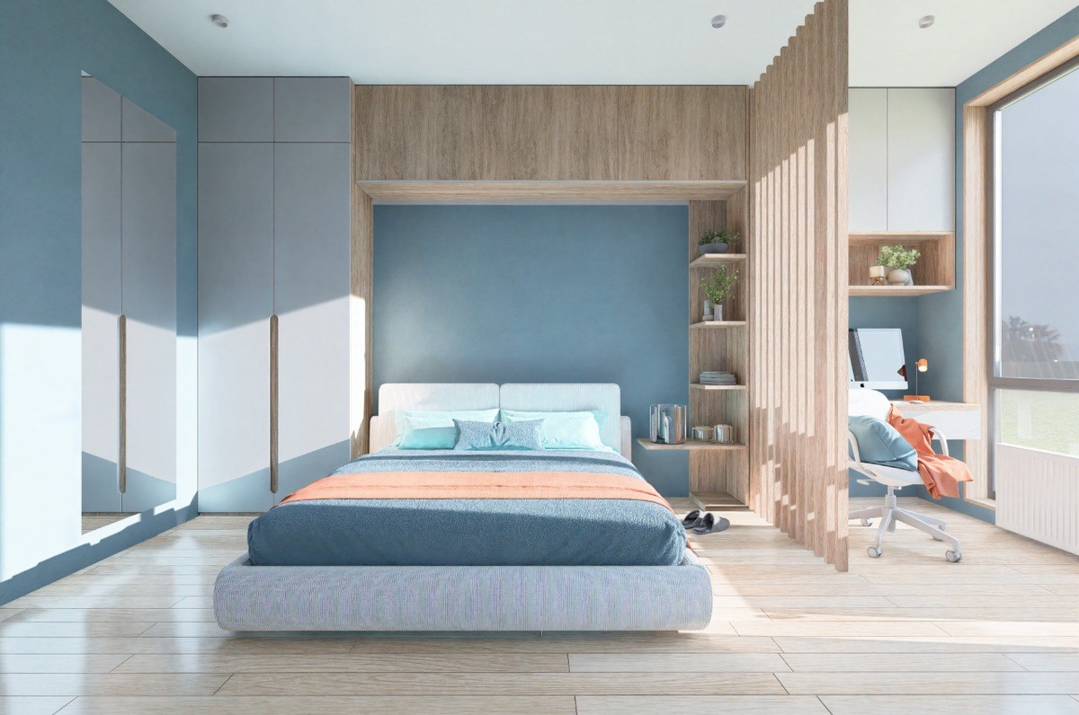 Представляем дизайн-проект спальни для нашего клиента, где каждый сантиметр продуман для комфорта и функциональности. 💡 Задача: Создать уютное пространство для отдыха, гармонично интегрировав в него полноценную рабочую зону, не перегружая интерьер. Наши решения: 🌿 Умное зонирование: Изящные деревянные рейки деликатно отделяют уютную зону сна от светлого и функционального рабочего места у окна. Это позволяет сохранить ощущение единого пространства, при этом четко разграничивая функции. ☀️ Естественный свет: Рабочее место расположено у окна, обеспечивая максимум дневного света, что важно для продуктивности и комфорта глаз. 📦 Продуманное хранение: Вместительный встроенный шкаф и открытые полки в рабочей зоне решают вопрос хранения, не загромождая пространство. Результат – стильное, светлое и невероятно функциональное пространство, идеально отвечающее потребностям современного человека. А если и вы мечтаете о спальне, которая будет вдохновлять на продуктивный день и дарить полноц