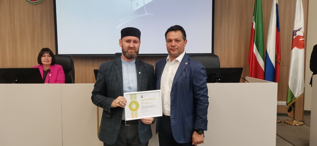 ☪️🇷🇺Сегодня глава Елабужского района Рустем Нуриев вручил сертификат имам-мухтасибу Елабужского района Халиму хазрату Шамсутдинову на сумму 30 тысяч рублей за победу в номинации «Самый гостеприимный шатер». Отметим, мухтасибат района уже второй год подряд принимает участие в конкурсе «Лучший шатер» в рамках проведения татарского народного праздника Сабантуя в г.Елабуга. И в этом году мухтасибат установил свой шатер во время Сабантуя, который прошел 15 июня в городском ипподроме, и представил свою деятельность, проведя также мастер-классы для всех участников.