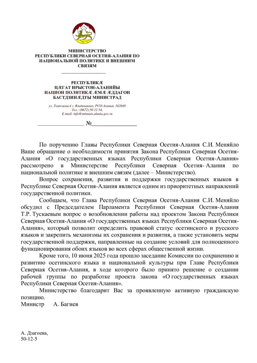 В ответ на пост Получили формальный ответ от Миннаца на обращение к главе о принятии Закона о госязыках. Руководство не ищет легких путей. Вынос вопроса на Комиссию, затем создание ею рабочей группы из филологов и историков для решения юридического вопроса, далее что? Долгие обсуждения? Это все надуманные процедуры, как надо понимать, призванные тянуть время, либо заволокитить вопрос в надежде, что энтузиазм осетинского народа схлынет, все само собой рассосется. Процедура подготовки законопроекта начинается с Правового управления правительства, далее проект направляется на рассмотрение в Парламент, с последующим принятием и подписанием Главой. Все обсуждения проекта надо проводить в рамках парламента. Иначе зачем нам 75 депутатов? А тут тянут время в открытую. (@IronDin)