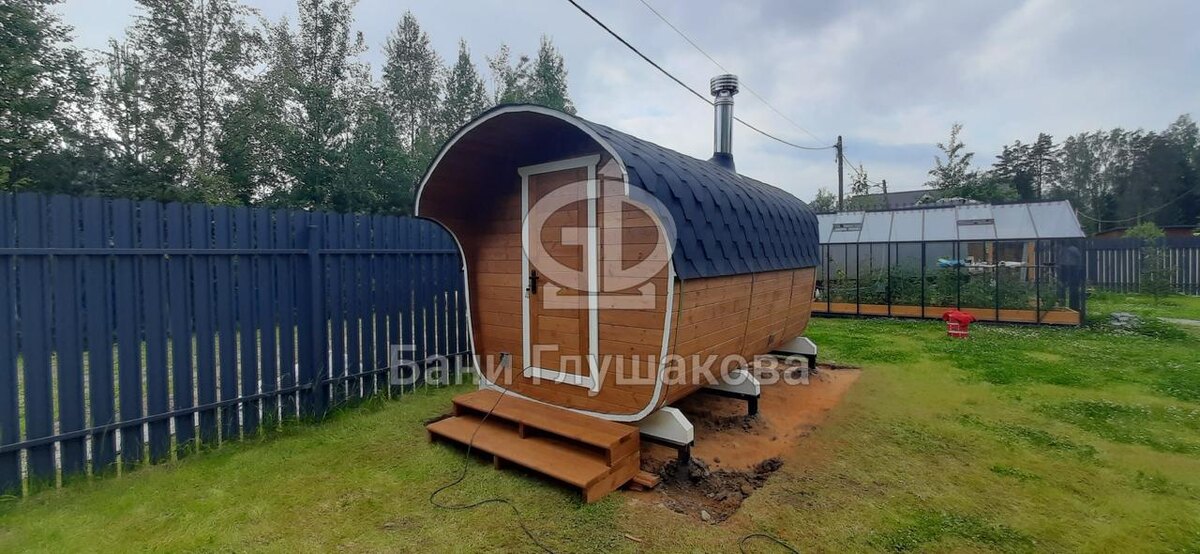 Наконец-то появились фотографии бани-бочки «Сказка» прямо на участке! До этого почти все снимки были с производства или выставок — а теперь