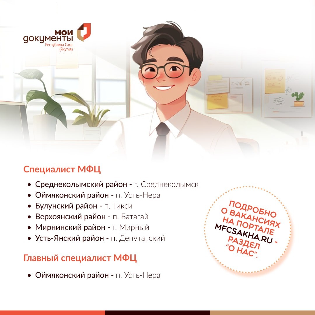 Присоединяйтесь к команде центра "Мои Документы"!❤️ ❤️Если вы ищете стабильную работу в дружелюбном коллективе, где сможете помогать людям и развиваться профессионально, то мы рады предложить вам вакансию! Почему стоит выбрать нас? ▪️Дружный коллектив ▪️Помощь людям ▪️Стабильная заработная плата ▪️Развитие и обучение ▪️Возможность карьерного роста ▪️Интересные проекты и задачи ▪️Сокращенная рабочая неделя для женщин (удобный график для мам с детьми) 🔥Мы ищем разносторонне развитых людей, которые готовы работать в команде и стремятся к личностному и профессиональному развитию. Отправьте свое резюме сегодня и начните новый этап своей карьеры в МФЦ!🚀