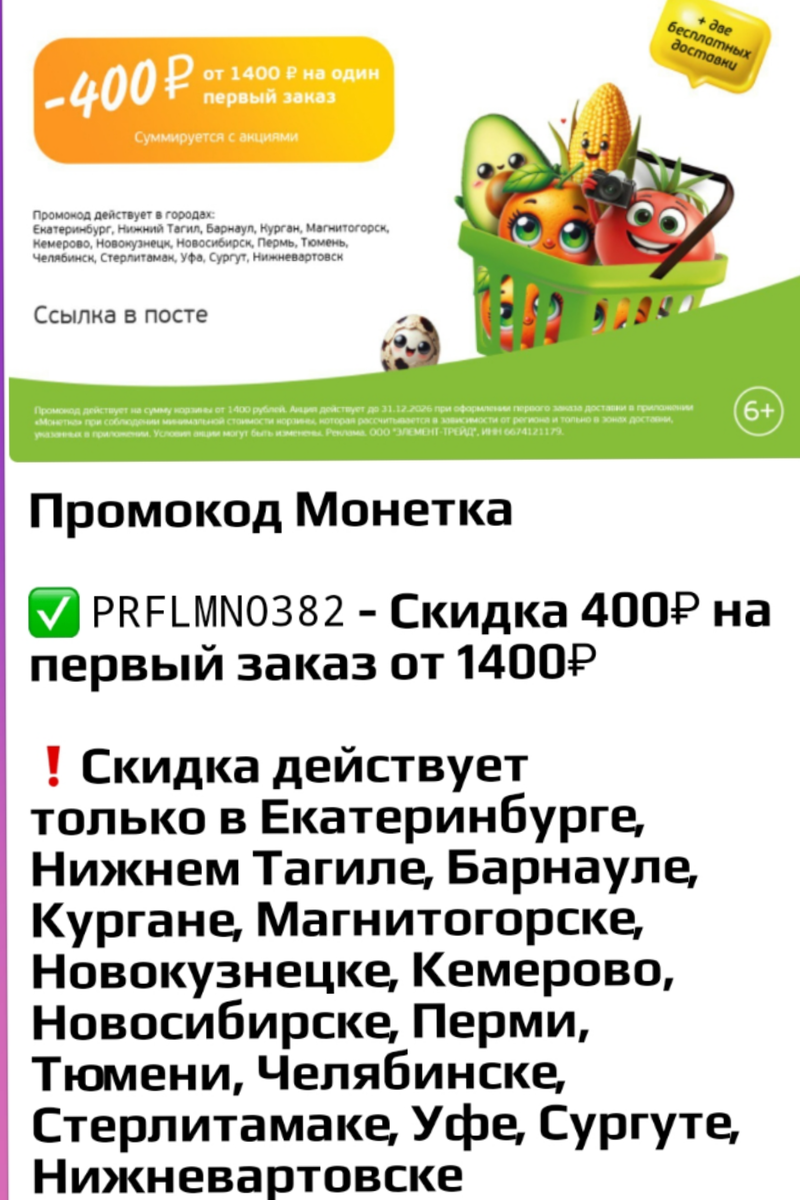 В тележке 🛒 нашёл такую ссылку. Бог велел делиться , но только хорошим. 👍 Если сервис действительно хороший, то будет рекомендация им пользоваться в конце статьи, если сатанидзе не закинет дегтя.😉 Скачиваем приложение "монетка" в русторе или гуглплэй. Как обычно тут одни ценники и картинки. Моя цель - найти выгоду и поделиться с людьми. По промокоду PRFLMNO382 ( ноль либо буква 0 могут содержать ошибку, которую вы должны определить самостоятельно, потому что я код копировал по итальяноско-мафиозной схеме "Paste" как главный в этой криминальной системе🤣🤣🤣 ) итальянскую лапшу снимаем с ушей при проведении аудита, по этому промокоду общают скидку в 40% на первый заказ + бесплатная доставка. Собираю заказ на 1400 рублей, и оставляю заявку. Узнаю что сервис работает только через Сбер, у меня небольшая проблема с ним , потому что я непримиримый борец с коррупцией в государстве. Немного поиграв в квесты с оплатой мне удалось оплатить заказ. За сборку заказа было уплачено примерно 3