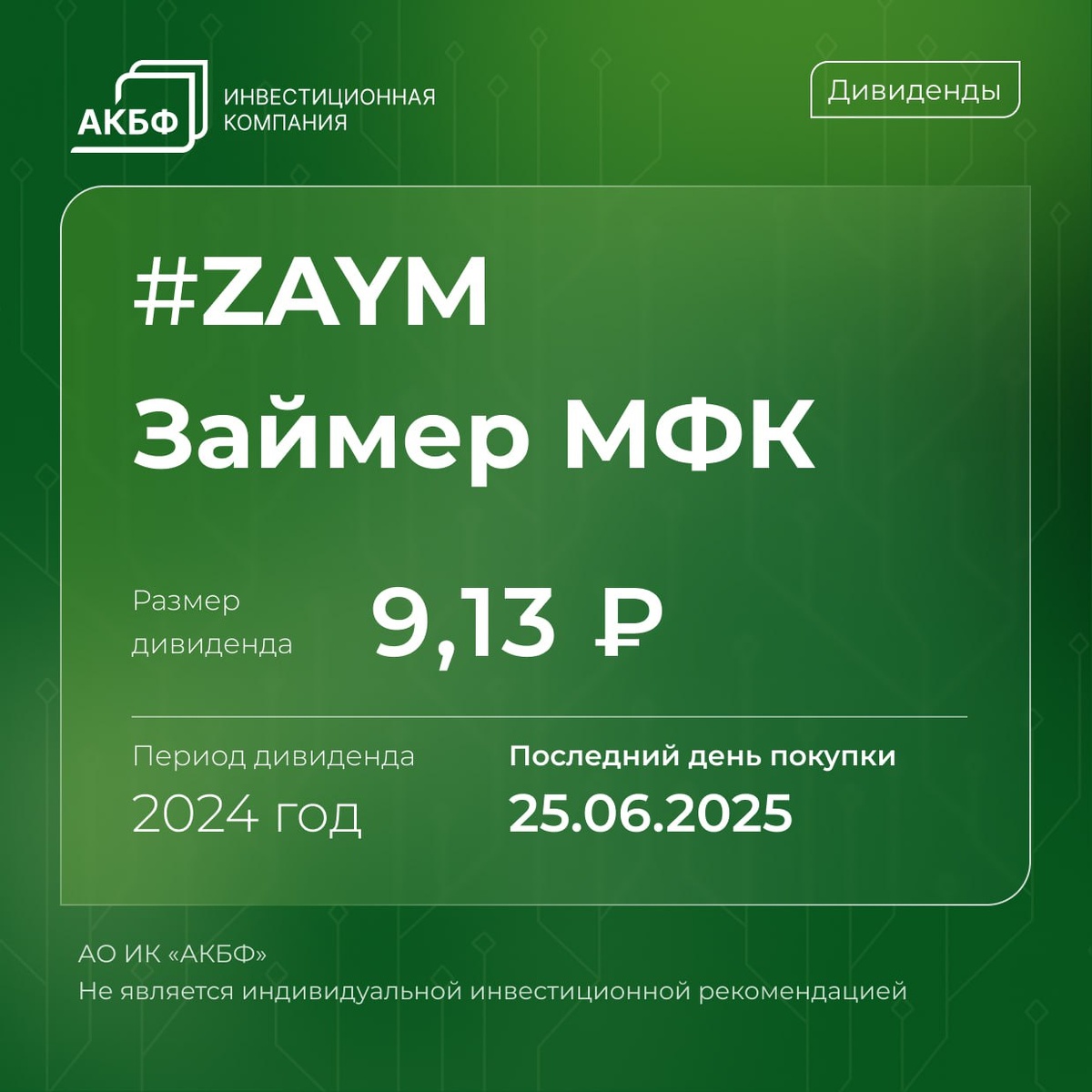 ΠΎΠ΄Π½ΡΠ΅ Π΄Π²Π΅ ΠΊΠΎΠΌΠΏΠ°Π½ΠΈΠΈ Π·Π°Π²Π΅ΡΡΠ°Ρ ΠΏΡΠΎΡΠ΅ΡΡ Π·Π°ΠΊΡΡΡΠΈΡ ΡΠ΅Π΅ΡΡΡΠ° Π΄Π»Ρ Π½Π°ΡΠΈΡΠ»Π΅Π½ΠΈΡ Π΄ΠΈΠ²ΠΈΠ΄Π΅Π½Π΄ΠΎΠ²: β’ ΠΠ°ΠΉΠΌΠ΅Ρ ΠΠ€Π β ΡΠ°Π·ΠΌΠ΅Ρ Π΄ΠΈΠ²ΠΈΠ΄Π΅Π½Π΄ΠΎΠ² Π½Π° ΠΎΠ±ΡΠΊΠ½ΠΎΠ²Π΅Π½Π½ΡΡ Π°ΠΊΡΠΈΡ ΡΠΎΡΡΠ°Π²ΠΈΡ 9,13β½ Π·Π° 2024 Π³ΠΎΠ΄ ΠΈ 4.58β½ Π·Π° 1 ΠΊΠ². 2025 Π³ΠΎΠ΄Π°. β’ Π’ΠΠ‘ ΡΠ½Π΅ΡΠ³ΠΎΠΠΎΡΠΎΠ½Π΅ΠΆ β ΡΠ°Π·ΠΌΠ΅Ρ Π΄ΠΈΠ²ΠΈΠ΄Π΅Π½Π΄ΠΎΠ² Π·Π° 2024 Π³ΠΎΠ΄ ΡΠΎΡΡΠ°Π²ΠΈΡ 6,95β½ Π½Π° ΠΎΠ±ΡΠΊΠ½ΠΎΠ²Π΅Π½Π½ΡΡ ΠΈ ΠΏΡΠΈΠ²ΠΈΠ»Π΅Π³ΠΈΡΠΎΠ²Π°Π½Π½ΡΡ Π°ΠΊΡΠΈΡ. Π§ΡΠΎΠ±Ρ ΠΏΠΎΠΏΠ°ΡΡΡ Π² ΡΠ΅Π΅ΡΡΡ ΠΈ ΠΏΠΎΠ»ΡΡΠΈΡΡ Π²ΡΠΏΠ»Π°ΡΡ, Π½Π΅ΠΎΠ±Ρ