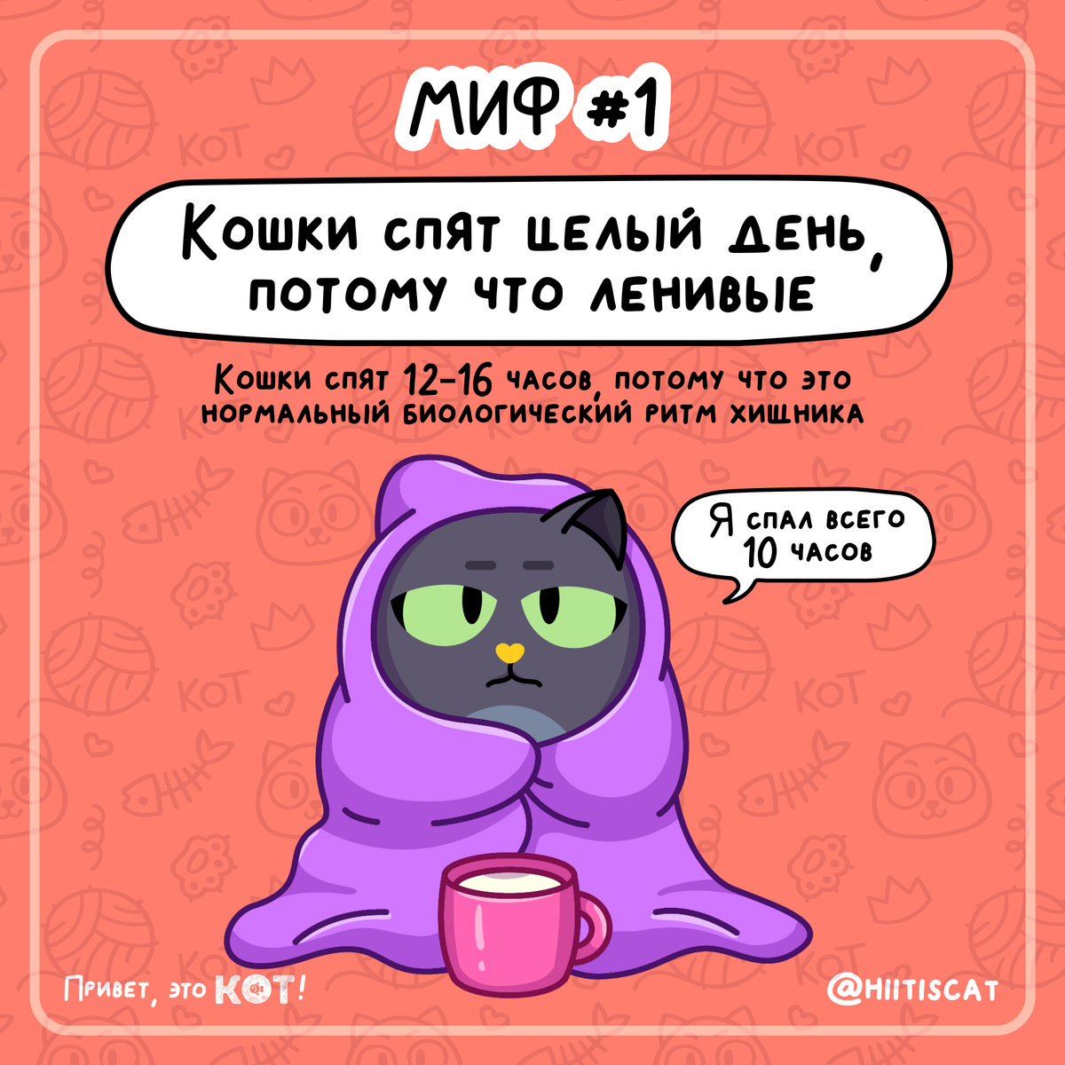 Кот уже наготове разоблачать самые странные, смешные и просто нелепые мифы о себе и своих пушистых друзьях. А ты во что верил? Пиши в комментариях свой любимый миф про кошек — вдруг Кот и до него доберётся в следующем выпуске! МИФ #1. Кошки спят целый день, потому что ленивые.