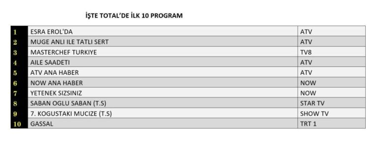 Кажется, в этот раз телезрители сделали свой выбор предельно ясно! 🎭 В понедельник, 23 июня 2025 года, экраны буквально дрожали от напряжения — кто же станет лидером? Редакция сайта cheek-look.ru проанализировала свежие данные, и вот что удалось выяснить. 🔥 На первом месте — шоу Esra Erol’da! Неудивительно, ведь Эсра Эрол давно завоевала сердца зрителей своей харизмой и умением находить общий язык с гостями. Вторую строчку уверенно заняла программа Müge Anlı ile Tatlı Sert — Муге Анлы снова доказала, что её формат остаётся одним из самых обсуждаемых. А бронза досталась MasterChef Türkiye — кулинарные баталии по-прежнему зажигают! 🍳 Здесь всё перевернулось с ног на голову! MasterChef Türkiye взлетел на первую позицию, оставив позади Müge Anlı ile Tatlı Sert. Видимо, зрители AB-группы предпочли сочные стейки острым расследованиям. Третье место заняла Aile Saadeti — семейные драмы всё ещё в тренде. 🕵️♀️ А вот здесь Müge Anlı ile Tatlı Sert триумфально вернула себе лидерство! Второе м