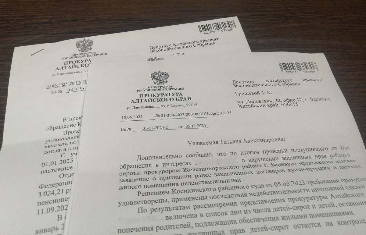 По обращениям в краевую прокуратуру депутата АКЗС Татьяны Грошевой удалось защитить жилищные права ребенка-сироты и добиться отмены незаконных удержаний из пенсии инвалида. По первому обращению прокурором Железнодорожного района Барнаула направлено исковое заявление в суд о признании ранее заключенных договоров купли-продажи и дарения жилого помещения недействительными. Требования прокурора были удовлетворены, а заявительница включена в список лиц, подлежащих обеспечению жилыми помещениями. Вопрос обеспечения жилищных прав остается на контроле органов краевой прокуратуры. В мае 2025 года к Татьяне Грошевой обратилась инвалид третьей группы с жалобой на удержания из пенсии, в результате которых у нее оставалось средств гораздо меньше прожиточного минимума. У женщины имеется задолженность перед ООО «Барнаульский водоканал», однако социальная пенсия вместе с федеральной доплатой только дотягивает до прожиточного минимума. Несмотря на то, что в Социальный фонд в начале апреля было напра