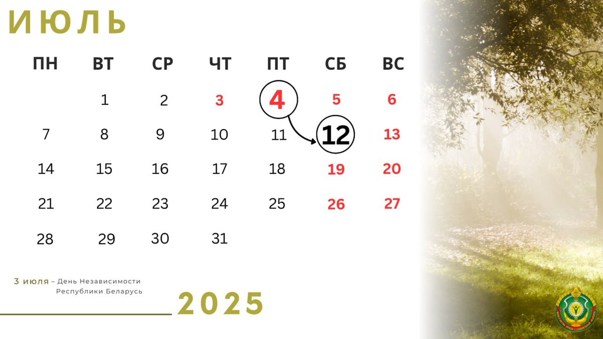 🌱🌿Впереди большие выходные. Рассказываем, как белорусы будут работать и отдыхать в июле ➡️ 3 июля (четверг) – День Независимости Республики Беларусь. Эта дата в нашей стране признана официальным выходным. 🔄Рабочий день с 4 июля (пятница) переносится на 12 июля (суббота). Таким образом, непрерывные выходные дни: 3,4,5,6 июля – 4 дня. 🗓Рабочие дни в июле В соответствии с производственным календарем у белорусов в июле ▪️при шестидневной рабочей неделе будет 26 рабочих дней, ▪️при пятидневной – 22 рабочих. 🧮Расчетная норма рабочего времени при 40-часовой рабочей неделе составит: ▪️для пятидневной рабочей недели с выходными днями в субботу и воскресенье – 175 часов; ▪️для шестидневной рабочей недели с выходным днем в воскресенье – 173 часа. 🏖Если на период больших выходных выпадает отпуск, командировка или обучение 🔗Если 4 июля (переносимый день) приходится на период: ▪️Отпуска (трудового, социального) работника => 12 июля является для него нерабочим (выходным) днем. ▪️Временно