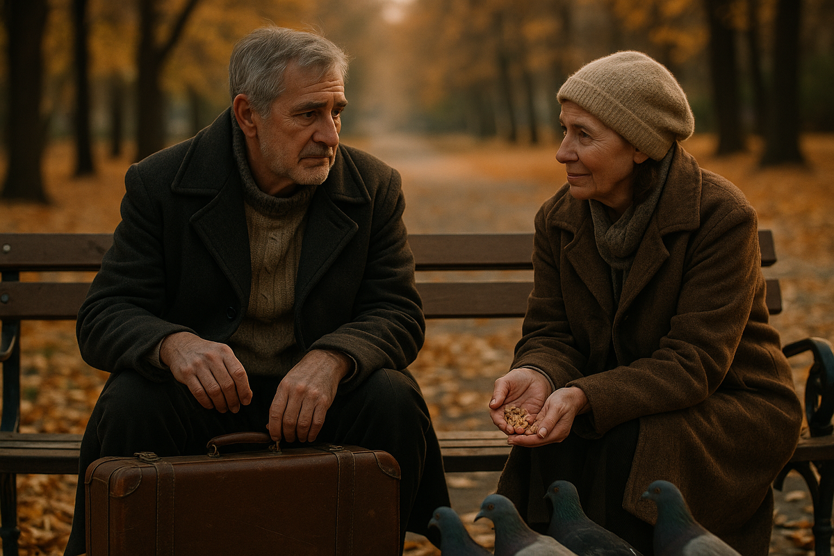 На следующее утро Алексей снова сидел на той же скамейке. Холодный ветер шевелил последние листья, падающие, как его надежды. Вокруг шли люди: молодые матери, пожилые пары, дети — каждый занят своей жизнью. Никто не замечал одинокого старика.
