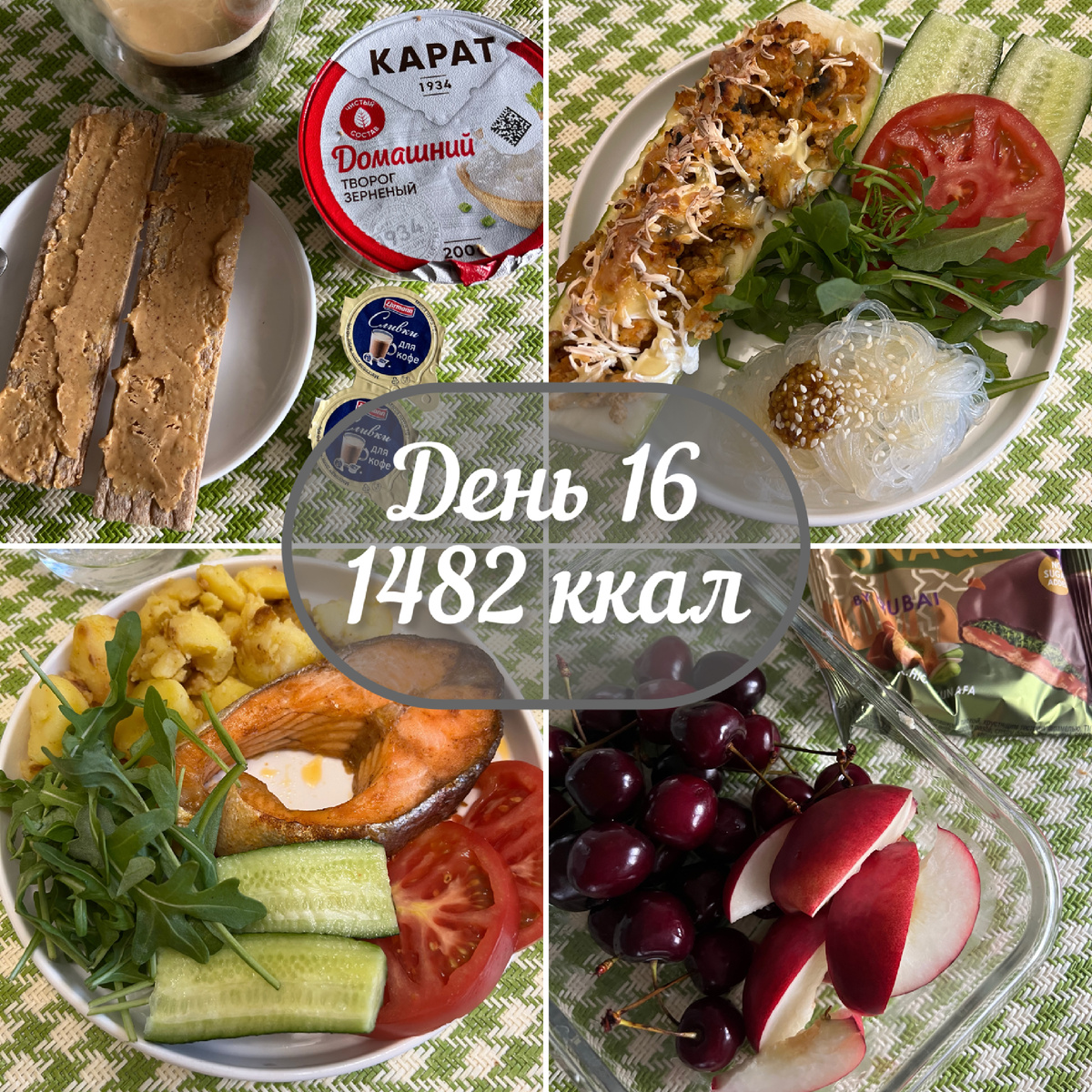 День 16 Завтрак Творог зерненый - 200 г Сливки в кофе 10 % - 20 г Хлебцы - 10 н ( фитнес Лайн 2 шт) Паста арахисовая - 10 г Обед Фаршированные кабачки ( рецепт прикреплю по ссылке ) Ингредиенты на 6 шт Протертые томаты - 130 г Грибы - 150 г Куриная грудка - 400 г Масло растит - 15 г Морковь - 50 г Кабачки ( уже без серединки) - 900 г Фета - 50 г Сыр 15% - 50 г КБЖУ на 1 порцию 199 ккал 20.8 / 1.5 / 6 Морковь и лук обжарить на масле , добавить грибы и грудку ( перебить в фарш) , кабачки почистить и нафаршировать , посыпать тертой Фетой и сыром , в духовку при 180 на 40 минут , если хотите , чтобы кабачки хрустели и на час , если хотите мягкие, но тогда сыром посыпайте после 30 минут в духовке . На обед съеден 1 кабачок Фунчоза - 25 г Руккола - 20 г Помидоры - 100 г Сливки в кофе - 20 г Ужин Форель стейк - 150 н в сыром виде Огурцы - 100 г Помидоры - 100 н Картофель отварной 150 г обжарила на 3 г растительного масла Перекус Черешня - 200 г Нектарин - 150 г Snaqer Dubai