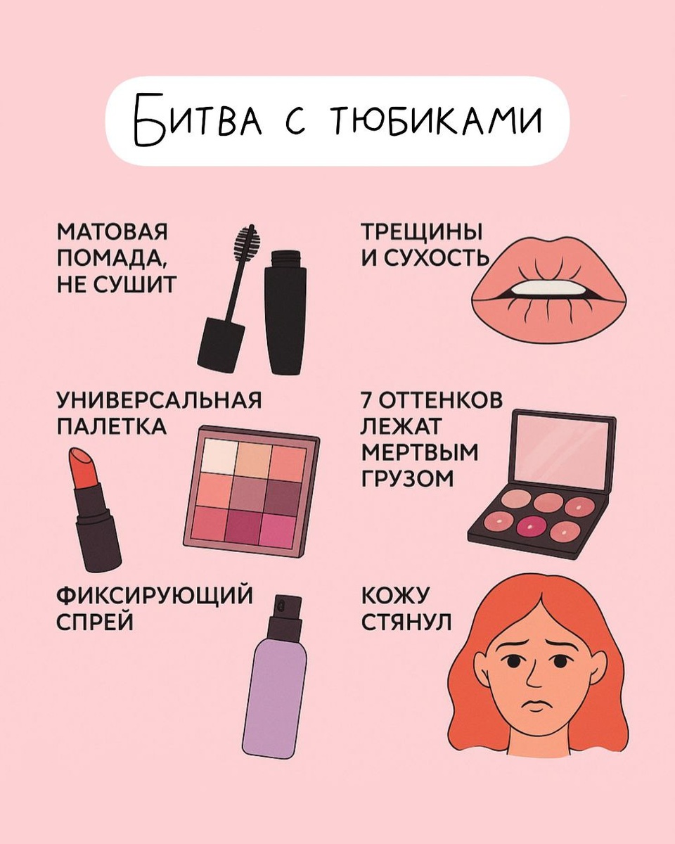Летний макияж: стойкость против жары, блеска и плавления Или как выглядеть на пятёрочку, даже если в вагоне метро +37 и кто-то наступил тебе на ногу 1. Тон Ожидание: хочу тон, как фильтр, и чтоб не плыл Реальность: к 13:00 лицо, как будто поджарилось в оливковом маслице Решение: • Увлажняющая база с сужающим поры эффектом • Лёгкий BB и сверху спрей с SPF 2. Консилер Ожидание: замажу всё Реальность: скаталось в каждую морщинку Решение: • Тонкий слой кремового консилера, только во внутренний уголок глаза • Лёгкая пудра закрепит эффект 3. Пудра Ожидание: фарфоровая кожи Реальность: всё видно, и поры, и шелушения Решение: • Минеральная пудра • Только Т-зона, и только нанесение кистью 4. Румяна Ожидание: нежный румянец Реальность: щёки из спортзала Решение: • Кремовые или тинтовые текстуры • Наносим на яблочки щёк, а на скулы нет 5. Тушь Ожидание: изгиб и глубина Реальность: панда на пенсии Решение: • Водостойкая тушь (нижние ресницы особенно) • Межрисничку подводим гелевыми кара