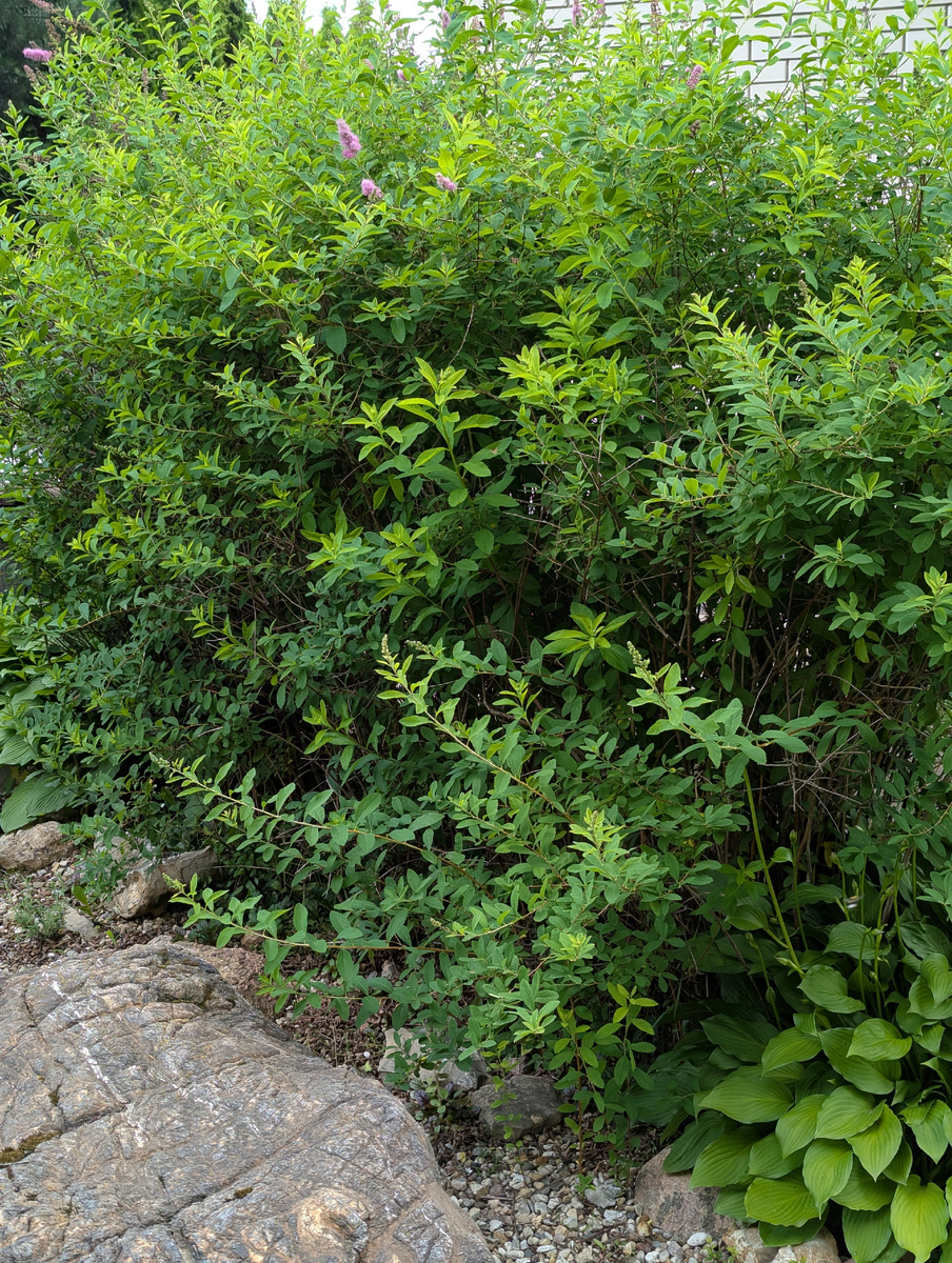 Задумала ещё прошлой осенью заменить ЖИ из спиреи Билларда на что-то более потребное. Эта живая изгородь в три куста сидит вдоль берега сухого ручья, на углу дома. Она создаёт такую хорошую кулуарность около заднего крыльца (технического выхода из дома). Прикрывает группу компостеров. Создаёт ширму от соседей рядом с креслом — мне нравится сидеть в саду, когда меня не видно, я стремлюсь к полной изолированности от случайных или неслучайных взглядов. И прикрывает зону огорода (от которого теперь осталась всего одна грядка, но всё же). Короче, она тут очень к месту, и хорошо разделяет пространство, концептуально мне всё нравится. Чем меня не устраивает спирея? В основном тем, что даёт очень много поросли, которая лезет везде. Надоело ее выстригать, выколупывать из отсыпки и мощения. К тому же сами кусты не самые декоративные, прямо скажем. Видали мы кусты и покрасивее. И ещё на них каждый год поселяется тля, что тоже уюта не добавляет. Есть у нее и несомненные плюсы - изгородь из спире