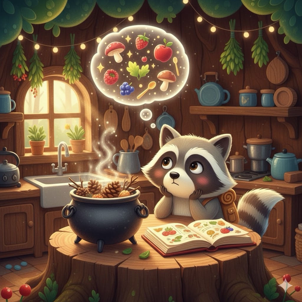После смешного случая с "супом" из шишек Енотик стал очень задумчивым. Он понял, что еда — это не просто что-то, что можно найти, а целое искусство! И ему очень захотелось научиться готовить по-настоящему вкусно.