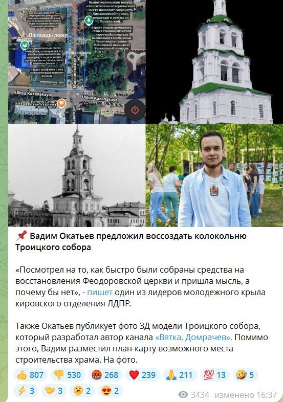 В Кирове предложили воссоздать колокольню Троицкого собора. Инициативу озвучил зам. председателя Молодёжного совета при главе города Кирова Вадим Окатьев (об этом писал Personal Opinion — на скрине). В комментарии «Бизнес Новостям» Окатьев отметил, что, по имеющимся данным, ещё в 2000-е годы был разработан проект воссоздания колокольни. Если «документы сохранились в архивах, достаточно будет их актуализировать»: — В случае поддержки готов заняться масштабной кампанией по сбору средств. Уверен, идея найдёт отклик у жителей Кирова, в том числе у бизнес-сообщества, как это произошло со строящейся заново копией Феодоровской церкви на набережной.