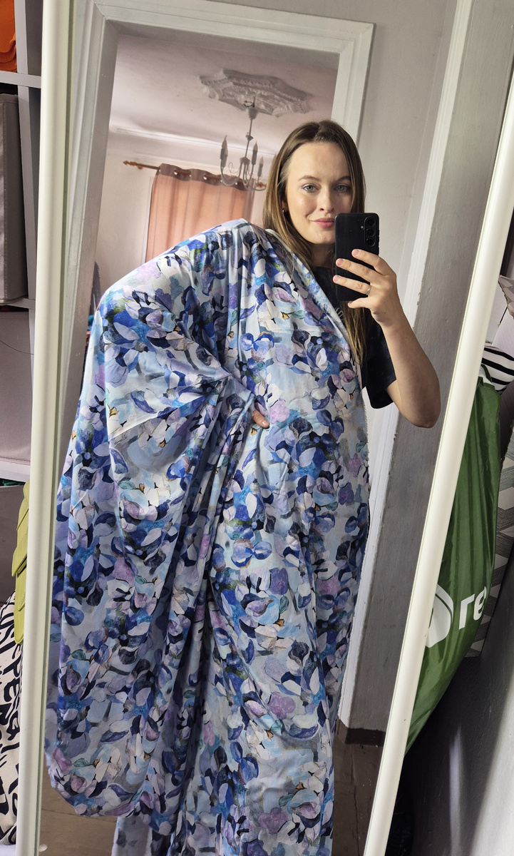В последнее время мне удаётся шить то, что не оставляет никого равнодушным, зрители поделились на два лагеря: вау, это супер и те, кому не нравится или он ожидал чего-то другого... Так случилось и с этим платьем. Более того, для него я создала выкройку, её можно приобрести на моём сайте) Итак, выбрала я вот такую ткань. По составу 100% вискоза. Ранее в статье рассказывала про декатировку вискозы. Эта дала усадку 9 см от 2 метров. Ткань тонкая, но чуть плотнее штапеля. Нити целлюлозы обработаны и переплетены так, что ткань имеет минимальную для вискозы сминаемость, что значительно облегчает уход за изделием. Мне очень понравился принт, он чем-то напоминает мне мотивы картин моего любимого русского художника Михаила Александровича Врубеля. Для себя в этом принте и цвете я нашла отголоски картин "Сирень", "Царевна-Лебедь", "Розы и орхидеи". Всё, что нам нравится так или иначе имеет отражение в нашей жизни. Пошив был лёгким и приятным) Знаете, когда всё идёт так как надо, как по маслу) На