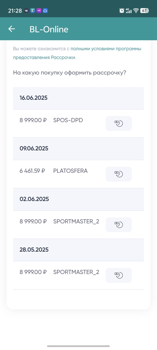 Зашёл в приложении банка, увидел новость, что появилась новая фича "Рассрочка" - посмотрел. Решил зайти в раздел. Раздел предложил оформить рассрочку на операцию возврата из магазина Спортмастер за 02.06.2025, интересно, конечно, получается 🙂