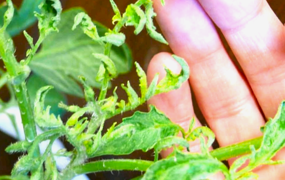 Вчера томаты были здоровыми. Сегодня макушки скрутились в тугие спирали!