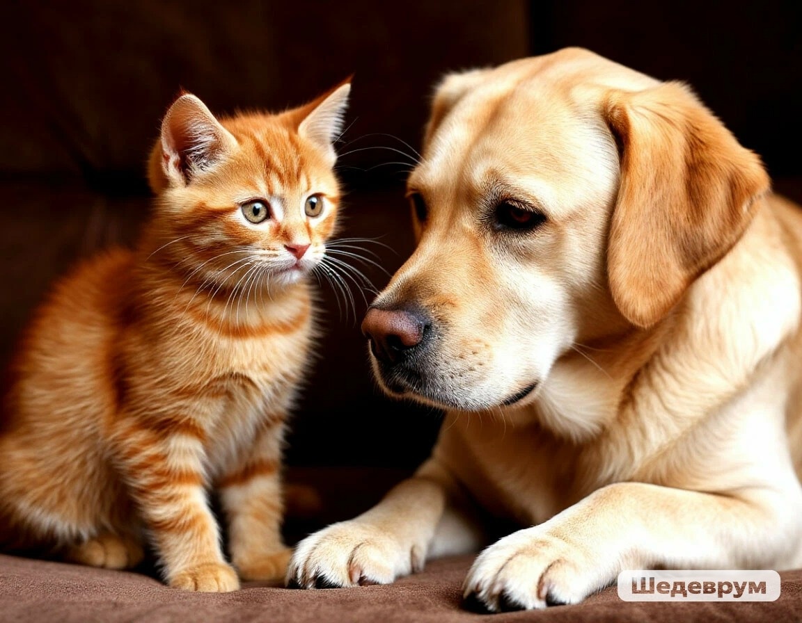 В один прекрасный день в наш дом попал маленький рыжий котёнок по имени Рыжик. Он был такой игривый и любопытный, что сразу привлёк внимание нашего лабрадора по кличке Брут. Никто не ожидал, что из этой встречи вырастет настоящая дружба. Рыжик осторожно исследовал новый дом, а Брут наблюдал за ним издали. Котёнок часто прятался под диваном, а Брут пытался понять, как ему относиться к этому новому существу. Первое время они держались на расстоянии, но голод и скука сделали своё дело. Однажды Рыжик забрёл слишком далеко и случайно оказался в зоне внимания Брута. Вместо того чтобы броситься на него, Брут начал показывать свои самые дружелюбные жесты: вилял хвостом и тихонько подталкивал котёнка носом. Рыжик, удивлённый таким приёмом, сначала настороженно, а потом с любопытством, принял приглашение к игре. С тех пор их дружба крепла день ото дня. Они стали неразлучными компаньонами в играх. Брут учил Рыжика ловить мячик и показывал, как правильно прятаться в кустах во дворе. Рыжик, в свою