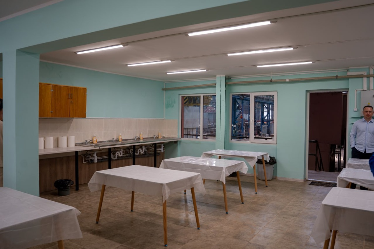 В одном из производственных цехов завода ОСК «Янтарь» состоялось открытие комнаты приема пищи с участием военнослужащих индийского фрегата, который строится на нашем предприятии. В цехе сборки и сварки металлоконструкций оборудовали комнату приема пищи. Раньше это было пустующее помещение без ремонта. Просторная комната позволяет разместить здесь не менее 50 человек. Теперь сотрудникам цеха можно с комфортом обедать. Помимо столов по периметру помещения расположены стойки, имеются микроволновые печи, электрочайники, несколько холодильников и раковин. «Строительство столовой производилось совместными силами нашего цеха и других подразделений завода. Не хочется никого выделять — все в равной степени старались сделать свою работу, — пояснил заместитель начальника цеха Михаил Бойченко. — Мебель и строительный материал нам помогло закупить руководства завода. Все было сделано ради улучшения условия труда работников». До этого времени сотрудники цеха питались в отдельных небольших комнатах о
