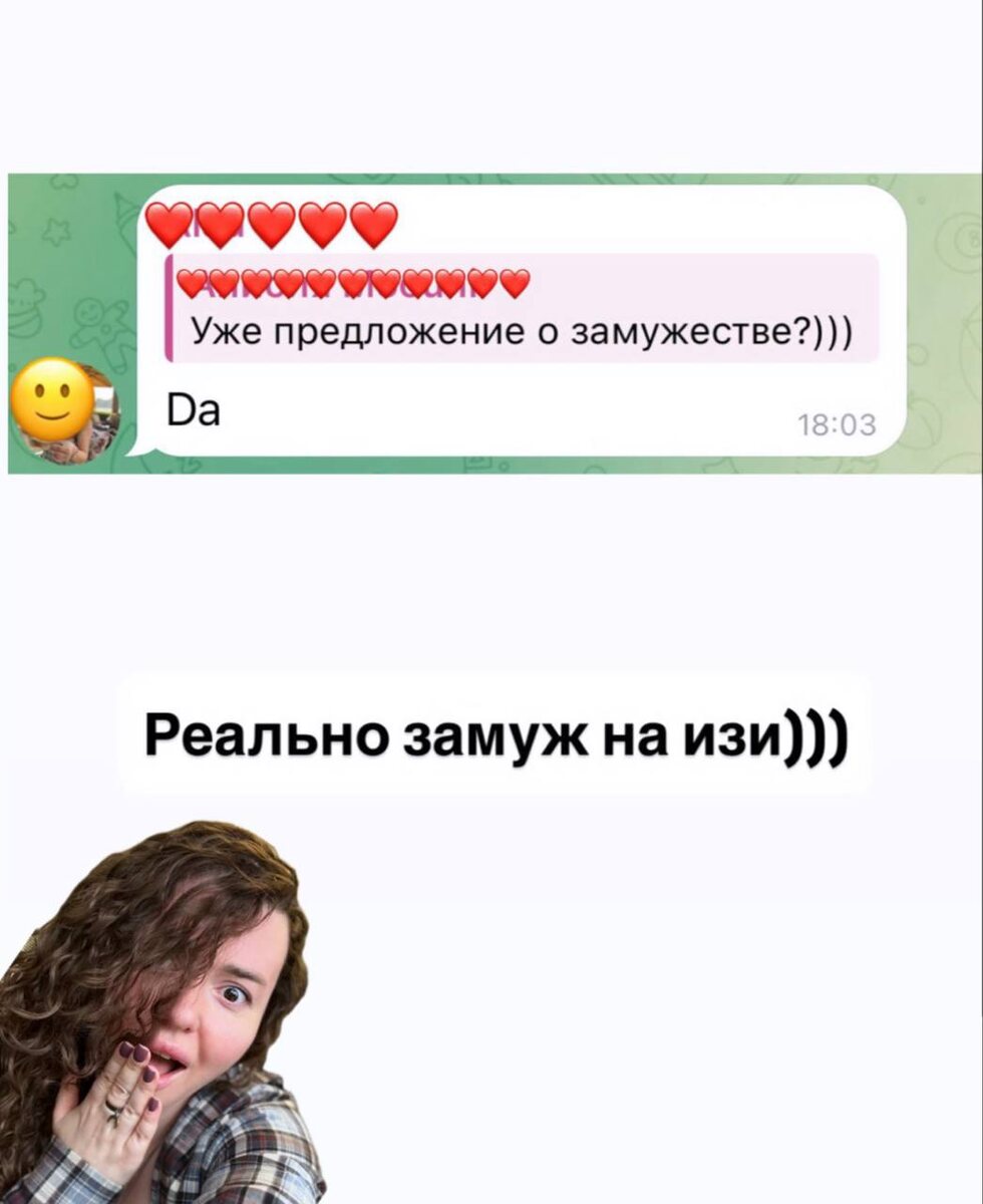 У меня был последний созвон с последним потоком «Замуж на Изи»-курса о знакомствах, свиданиях, отношениях и вот на какой ноте мы его закончили: Одна из 5 участниц получила ПРЕДЛОЖЕНИЕ о замужестве от иностранца)) Хотя 2 месяца назад они еще не были знакомы))) Прекрасная точка моего обучения✊😁