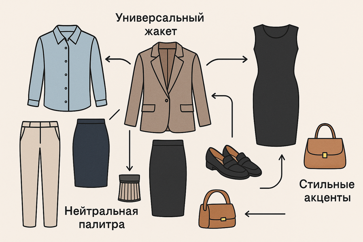 Офис — не подиум… но и не «мода на выживание»! Согласитесь, встречают по одёжке — особенно на работе. Деловой образ — это не просто «правильный фасон». Это маркер вкуса, уважения к себе, команде и делу, которым вы занимаетесь. И даже если дресс-код формальный, всегда можно выглядеть современно, свежо и интересно. Главное — найти свой баланс. • Базовая белая/бежевая/светло-голубая рубашка • Классические брюки прямого или чуть зауженного кроя • Юбка-карандаш или миди А-силуэта • Жакет или структурированный кардиган • Платье-футляр или лаконичное платье-миди • Лодочки или лоферы на невысоком каблуке • Аккуратная сумка, нейтрального цвета • Шарф или платок — для акцента Совет: Не обязательно ограничиваться только чёрным! Серый, бежевый, тёмно-синий, пастельные тона — прекрасно работают в офисе. Классические серые брюки, голубая рубашка, тёмно-синий жакет, лодочки. Сумка — структурированная, серьги-гвоздики. Платье-футляр пастельного оттенка, бежевый кардиган, лоферы, лёгкий шарф в тон. Юб