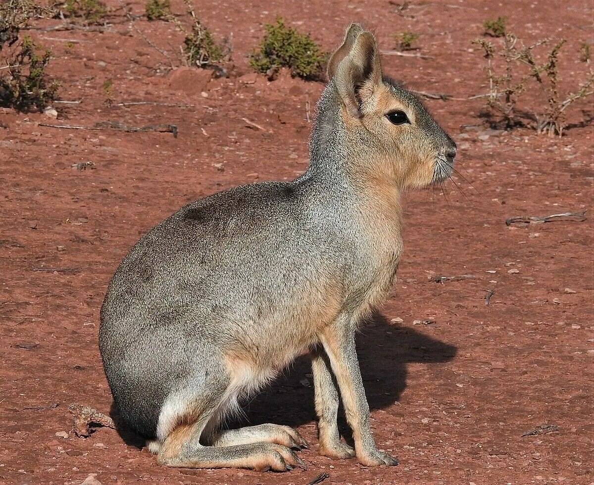 Мары — род грызунов из семейства свинковых. Характеристики: •Длина тела — 70–75 см, вес — от 8 до 18 кг. •Хвост короткий, 4–5 см, практически незаметный. •Высота в холке — около 45–50 см. •Внешне напоминает зайца или небольшое копытное животное: длинные мускулистые задние лапы, короткие передние конечности, похожие на копыта, и крупные чёрные глаза с густыми ресницами. •Уши короткие, а мех густой, серо-коричневый на спине с белым пятном на крестце, отделённым чёрной полосой. •Передвигается скачками, развивая скорость до 30–45 км/ч. •В отличие от большинства грызунов, мары моногамны — образуют постоянные пары на всю жизнь. •Мары — строгие вегетарианцы, их рацион включает травы, листья, корни, семена и даже кактусы. Мары живут в южной части Южной Америки, преимущественно в Аргентине, в регионе Патагония. Ставь лайк 😃 👍