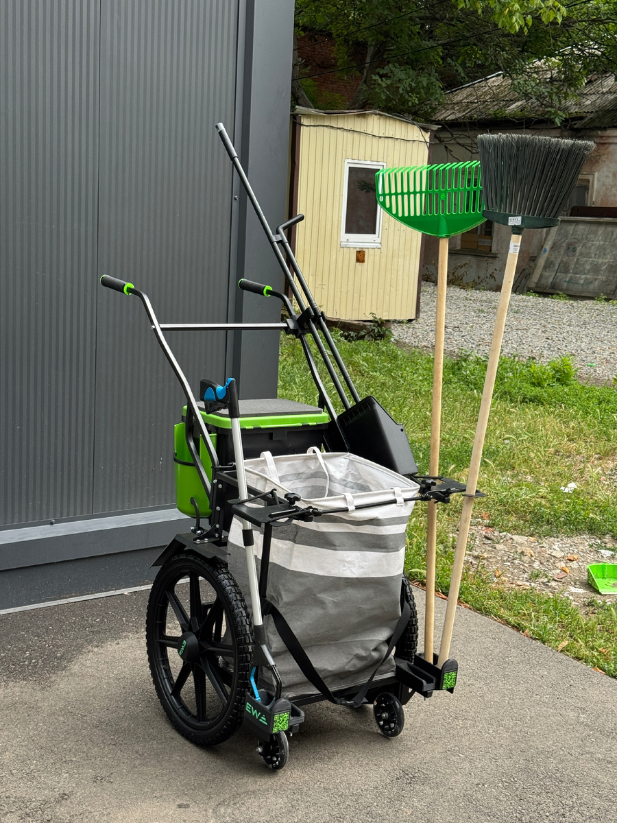 - Тяжелый и громоздкий инструмент больше не нужно носить в руках. На тележке установлены крепления для инструмента. Помещается щетка, совок, захват для мусора и даже воздуходувка. Мелкие вещи вроде мешков и перчаток можно положить в навесной ящик-сиденье.