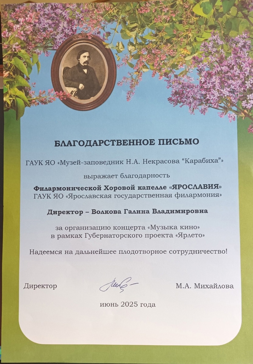 Поздравляем! Филармонической хоровой капелле "ЯРОСЛАВИЯ" под управлением Владимира КОНТАРЕВА и директору коллектива Галине ВОЛКОВОЙ - за организацию и исполнение концертной программы 07 июня 2025 г. "Музыка кино" - дирижёр Эрик СУКИАСЯН, в рамках Губернаторского проекта "Ярлето", выражена благодарность директора ГАУК ЯО "Музея - заповедника Н.А. Некрасова "Карабиха" Михайловой М.А. 👏👏👏👏👏 Источник: https://vk.com/wall-199946929_1929