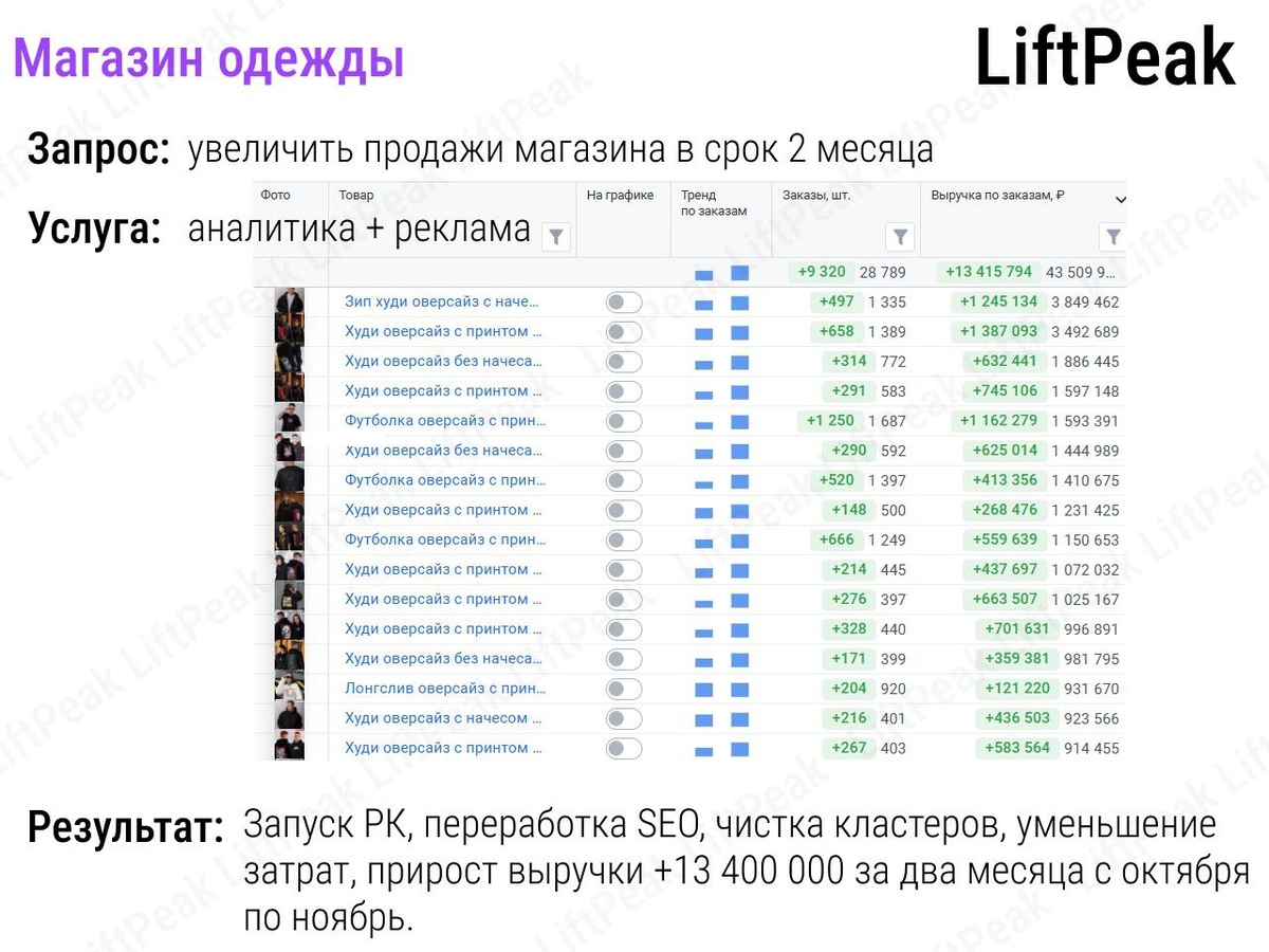 Запрос: увеличить продажи за 2 месяца. Что сделали: не влили бюджет — а разобрали воронку, оптимизировали, и только потом усилили рекламой. --- 📌 Вступление: когда «быстрее» не значит «слить» Продавец одежды пришёл к нам с задачей: нужно срочно нарастить продажи. В прошлом запускал рекламу, но эффекта не было. Товар — хороший, выкупы — есть. Но весь рост как будто застопорился. Первым делом мы не пошли настраивать РК, а открыли аналитику: MPStats + дашборд LiftPeak. И поняли, где зарыты деньги. --- 🔍 Этап 1: Разбор воронки продаж На скрине видно, как по каждому товару мы считали: – выручку с заказов – динамику по заказам – рост или падение спроса И сразу выявили, какие товары тащат вверх, а какие забирают трафик, но не конвертируют. Такие позиции мы: – отключили из рекламы – частично сняли со стока – отдали в распродажу Это освободило бюджет и дало точку опоры для следующего шага. --- 🔧 Этап 2: SEO и чистка кластеров Самая недооценённая работа. Мы переписали заголовки по формуле: >