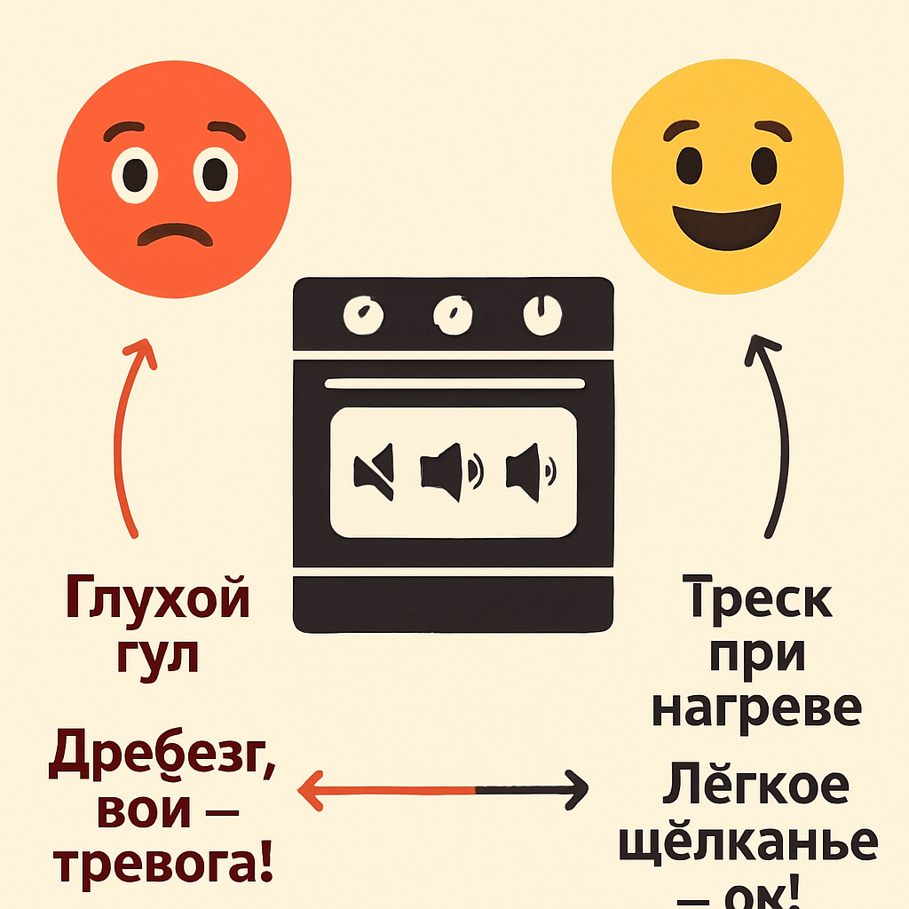 — Ты когда-нибудь слышал, как духовка «разговаривает»? Включаешь — и вдруг: треск, щёлканье, глухой гул… Сразу мысли: сломалась?! Бежать за новым? Или не всё так страшно? Меня зовут Кононов Андрей Фёдорович. За свою практику я встречал духовки, которые пугали своих хозяек звуками не хуже фильмов ужасов. Но знаешь, далеко не всегда это признак поломки. Давай разберёмся вместе: какие звуки — норма, а когда стоит задуматься о ремонте. • Лёгкий треск или щёлканье в начале нагрева — почти всегда нормально. • Металл расширяется, детали «усаживаются» на свои места, иногда щёлкает термостат. • Еле слышный гул вентилятора — тоже норма. • Громкое дребезжание, • Вой, глухой гул, • Регулярные «удары» или непрекращающийся треск… — Это уже сигнал! Духовка явно просит внимания. Теперь по порядку — что чаще всего «поёт» в духовке? — Вот тут начинается настоящий симфонический оркестр. В процессе нагрева металл расширяется, а при остывании сжимается. Иногда листы корпуса или противень чуть изгибаются,