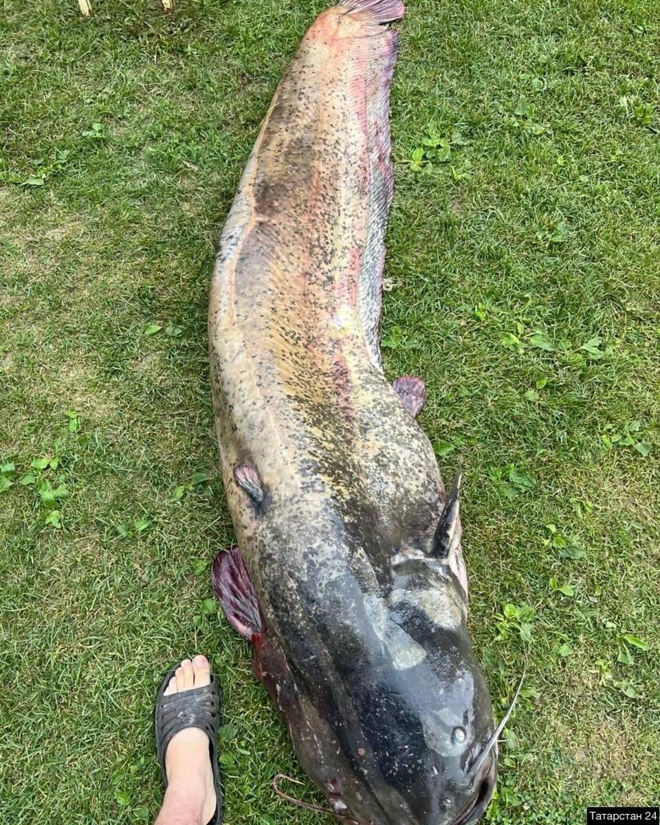 Рыбак выловил огромного сома весом в 95 килограмм и длинной в 3 метра. На фото можно сопоставить размер кота и размер сома.