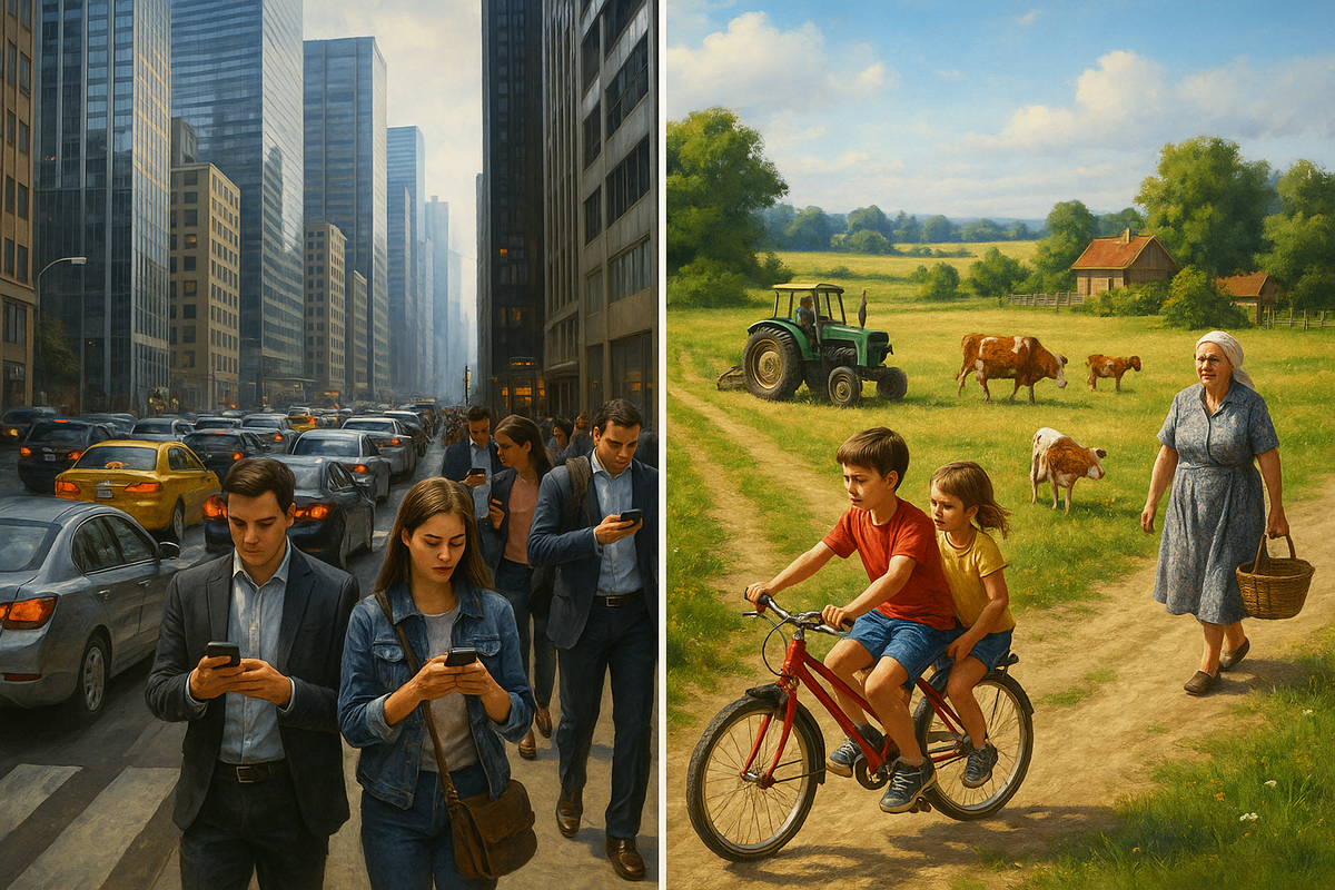 В городе работа, учеба, дела, в деревне отдых, здоровье, природа, тогда жизнь становится полной, богатой на впечатления. Город даёт возможности, деревня дает силы и покой.