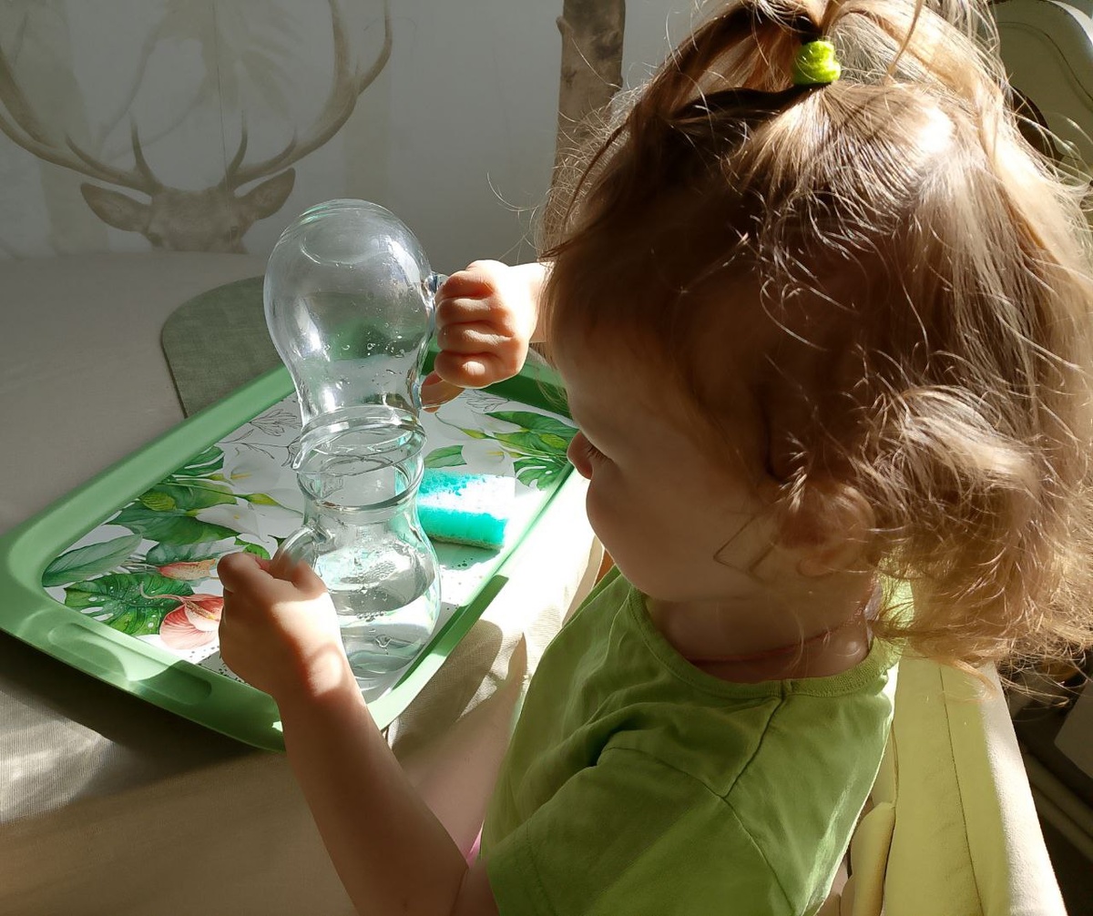 По идее надо акцентировать внимание малыша на том, не пролилось ли что-то на поднос. Для этого кувшины ставим за него, и, если на подносе есть вода, показываем ребёнку, как вытереть её салфеткой. Но дочь практически не выпускает кувшины из рук, поэтому я просто по ходу занятия вытираю жидкость на подносе, когда ее становится слишком много.