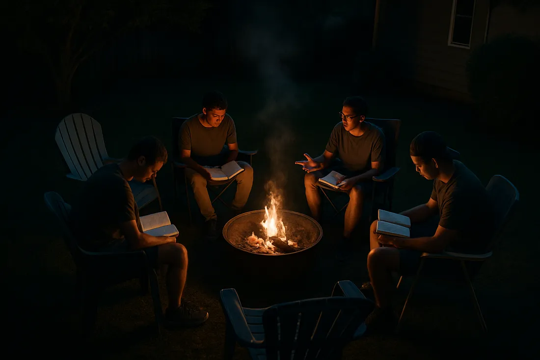 Я пришёл достаточно поздно, чтобы не выглядеть слишком рьяным, но и не настолько, чтобы показаться грубым. Это было не в типичном церковном классе с пластиковыми стульями и черствым кофе, а у него на заднем дворе. В углу дымился гриль, в кругу стояли разномастные походные кресла, а в центре потрескивал костёр, разбрасывая искры в ночи.