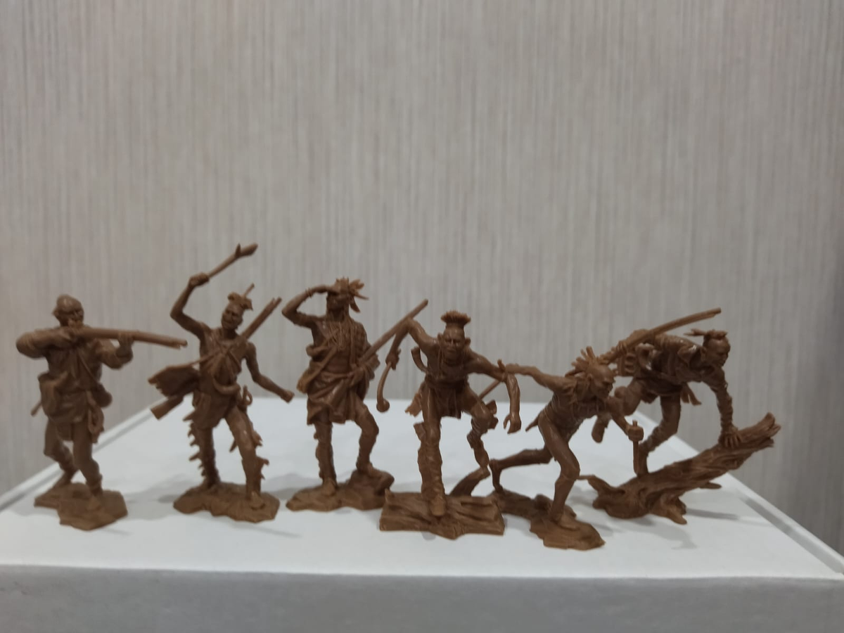 Ave любители солдатиков! Последние дни июня 2025 года все ближе, а цифра в данной рубрике все больше ;) Если первое не особо радует (лично у нас лето пока непривычно холодное - где же жара?), то второе очень даже хорошо! Ну, а сегодня Сергей Тарасов продемонстрировал свое новое приобретение - набор индейцев от "Публия". Фотографии - Сергея Тарасова. Набор индейцев от "Публия". Материал - резинопластик. 6 фигур. Масштаб 1/32. Коробочки для набора не было. От себя добавлю, что в этом наборе есть миниатюры с замечательными динамическими позами. А это пожалуй, самая колоритная фигурка набора - индеец перепрыгивающий через бревно. Настоящая визитная карточка данного комплекта. Оттиск "Публия" на подставке: Как вам такой набор? __________________________________________________________________________________________ Если вам понравился материал, поставьте лайк, напишите комментарий и подпишитесь на этот канал - впереди у нас много интересного!