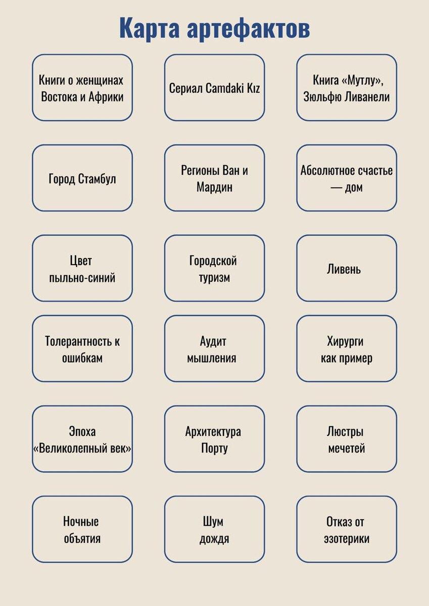 Если нужно заняться какой-нибудь херней в полночь — я в деле. Так что вчера до двух ночи я составляла список артефактов своей личности. Это как детская анкета: отвечаешь на вопросы о себе из головы — какая книга, какая архитектура, какой отдых… Ну и не просто называешь, ясен перец, а объясняешь, какую ценность для тебя несет этот артефакт. Собрала артефакты в визуальную карту + в комментариях пояснила логику ценности. Так как я довольно хорошо с собой знакома, ничего нового я не узнала, зато поняла через что и как выражены мои личностные черты. Вот это точно увлекательное путешествие. Интересно, сейчас – когда вы увидели карту моей личности, что можете сказать: ваше представление обо мне изменилось, расширилась, испортилось, улучшилось? Что стало неожиданным, а что было итак понятно? — Если кто-то хочет собрать свою карту, можно поотвечать на эти вопросы.