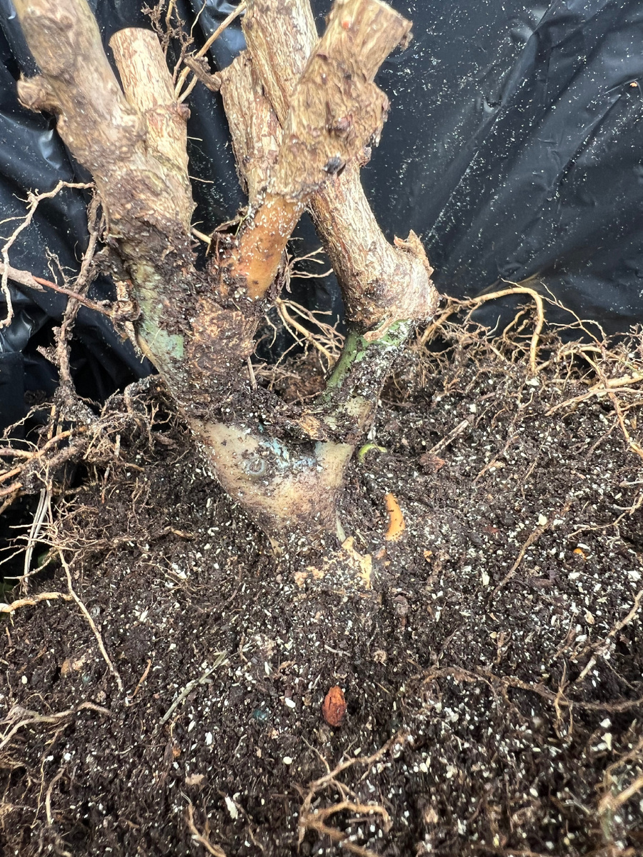 Естественно, два года просидев в мокрой земле ( мы же еще пооиваем всем подряд чтобы куст ожил) корневая шейка просто сгнила