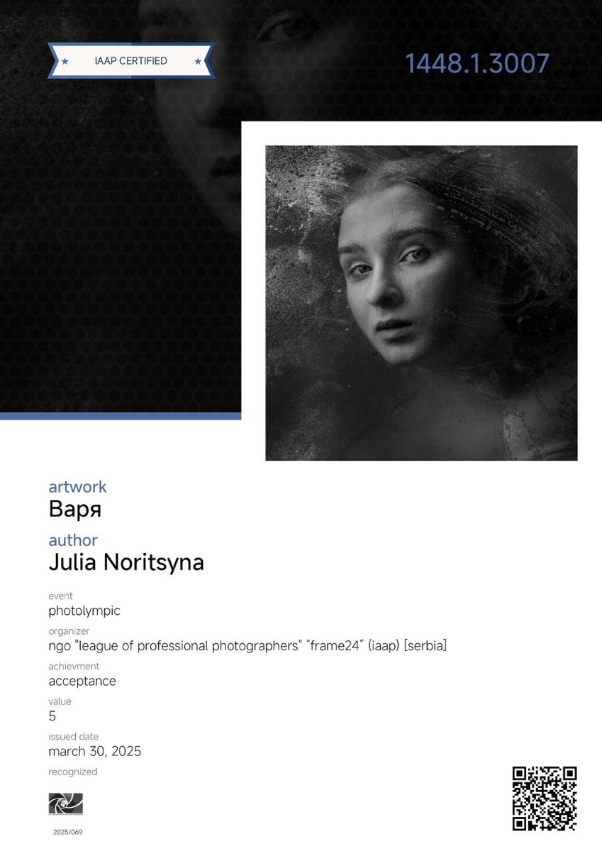 💥Фотографии студентки ГИКИТ Юлии Норицыной вошли в коллекцию 2025 года Международной Ассоциации фотографического искусства IAAP (Сербия) Юлия — студентка второго курса мастерской операторского искусства Николая Волкова, Сергея Ландо и Ивана Турухано, уже имеет награды международного уровня в области фотоискусства. 👏Поздравляем с новым профессиональным достижением!