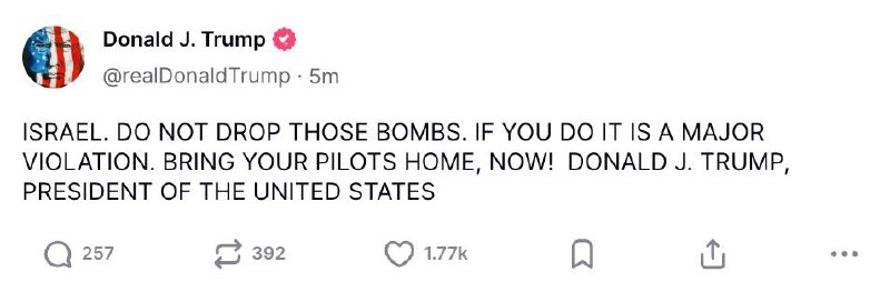 🇺🇸💬 Отдельно Трамп раскритиковал Израиль у себя на странице в соцсетях: «Израиль. Не сбрасывайте бомбы. Если вы это сделаете, это будет серьезным нарушением. Немедленно верните своих пилотов домой!»