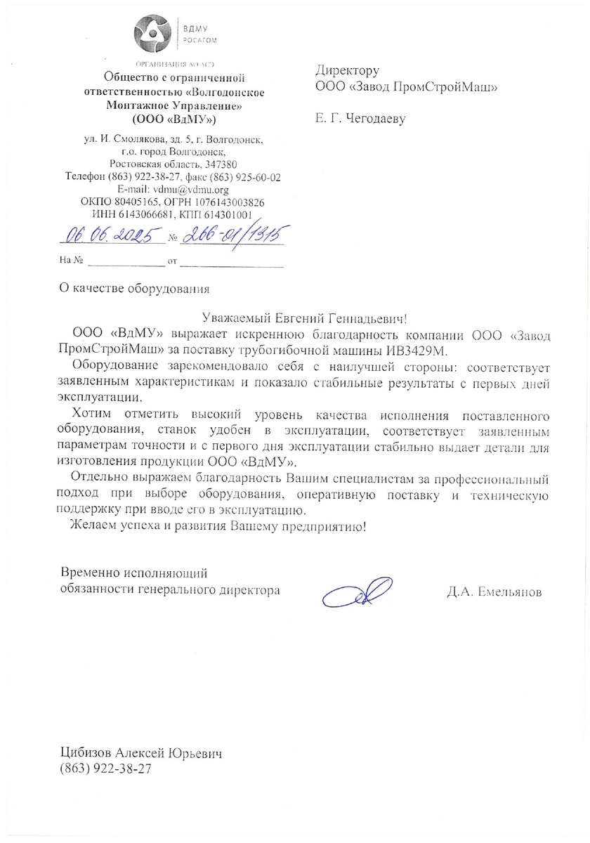 Доброго дня, Господа! Недавно мы делились с вами техническими особенностями трубогибочной машины ИВ3429М. Сегодня — хорошие новости: станок не просто нашёл своего заказчика, но и получил высокую оценку в реальной эксплуатации. Компания ООО «Волгодонское Монтажное Управление» (ВдМУ) направила официальный отзыв, в котором отмечает: «Оборудование зарекомендовало себя с наилучшей стороны: соответствует заявленным характеристикам и показало стабильные результаты с первых дней эксплуатации. Станок удобен в эксплуатации, с первого дня стабильно выдаёт детали для изготовления продукции. Отдельная благодарность — за профессиональный подход, оперативную поставку и техническую поддержку при вводе в эксплуатацию.» Для нас, как производителя, нет более надёжной оценки, чем результат на площадке клиента. Мы благодарим ООО «ВдМУ» за доверие и высокую оценку работы как станка, так и всей команды ПромСтройМаш. Станки модели ИВ остаются одной из наиболее востребованных моделей в линейке трубогибочного о