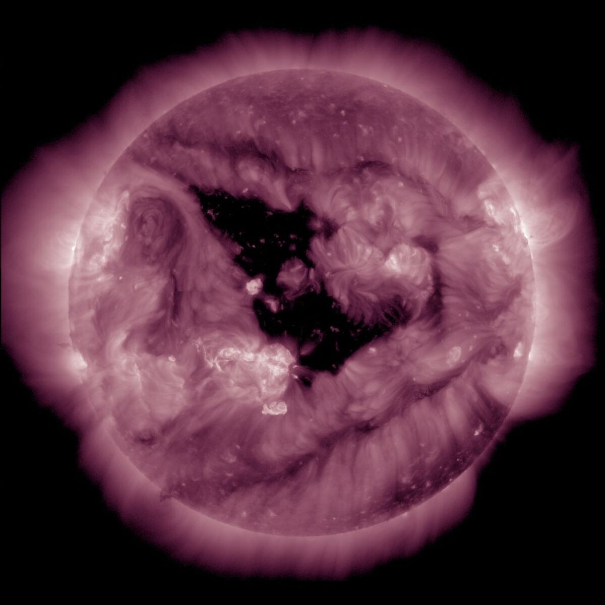 На поверхности Солнца образовалась обширная корональная дыра, которая сейчас обращена прямо к Земле. Это необычное явление, когда магнитное поле звезды словно размыкается, выпуская потоки солнечного ветра в космическое пространство, может привести к геомагнитным возмущениям уже в ближайшие дни.