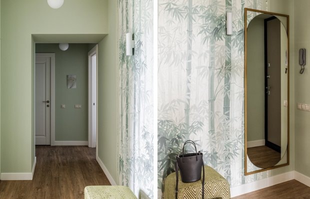 Здесь входная зона задает настроение всему интерьеру Первое впечатление от дома всегда формируется в прихожей: в этом проекте дизайнер Юрий Воробьев сделал все, чтобы пространство оказалось не просто положительным, а по-настоящему вдохновляющим. Интерьер квартиры в сталинке 1953 года разрабатывался для молодой девушки, влюблённой в теплые страны, уют и природные мотивы. Вдохновением стал зеленый карликовый ара — попугай хозяйки — и атмосфера южных широт, где свет, растительность и текстуры формируют чувство спокойствия и мягкости. В квартире провели перепланировку: кухню объединили с гостиной, увеличили ванную комнату и гардеробную. При этом прихожую решили не изолировать — она осталась связующим звеном между всеми помещениями. Благодаря высокому потолку (3 метра) и обилию естественного света с прилегающей стороны, дизайнеры смогли сделать входную зону не утилитарным пространством, а полноценной частью уютного и живого интерьера. Основной цвет стен — мягкий зеленый — выбран неслучайно: