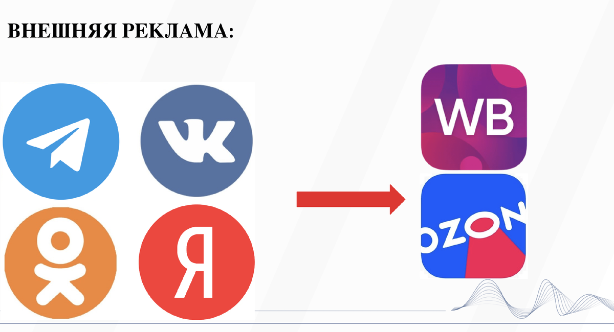 Формально внешняя реклама выглядит так, трафик может идти как на Вайлдберриз, так и на Озон, так и в 2 или 3 плейсмента сразу.