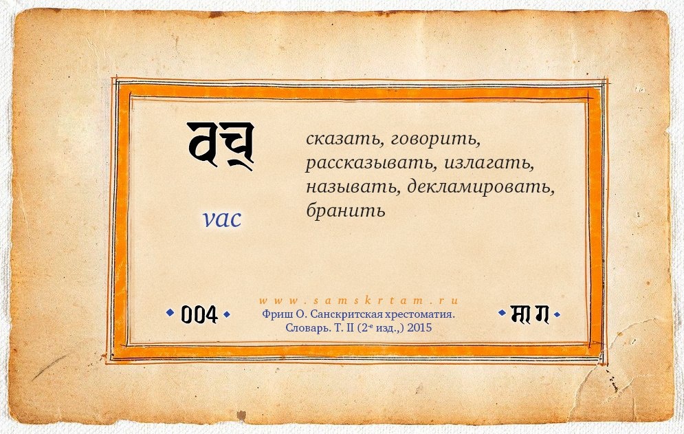 №4 "√vac vakti (ved. vivakti), pp. ukta; сказать, говорить, рассказывать, излагать, называть, декламировать, бранить"