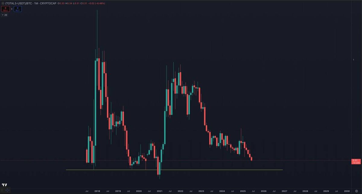Альткоины — это просто осциллятор по отношению к биткоину. Не больше. На графике — TOTAL3 / BTC, то есть капитализация альткоинов (без BTC и ETH), выраженная в биткоине. И он снова у исторического дна. — В 2018 — дно — В 2020 — дно — Сейчас — опять там же Многие всё ещё ждут “альтсезон как в 2021”, но рынок показывает другое. История не повторяется, но она рифмуется. И пока рифма не в пользу альтов. Почему это важно? Потому что это убирает эмоции. Убирает надежду на чудо, FOMO и гнев на блогеров, которые рисовали “взрывной рост”. Рынок показывает: — Альты перегреваются в фазе эйфории — Потом теряют 70–90% по отношению к BTC — И только единицы возвращаются К чему всё идёт? — Либо это зона исторического разворота и повторится 2020 — Либо альты окончательно теряют интерес, и капитал остаётся в BTC/ETH/реальных кейсах В обоих случаях — вывод один: не инвестируйте в альткоины как будто они «вторая надежда». Это венчур. Это спекуляция. Это фаза, а не стратегия. Если хотите — сделаю